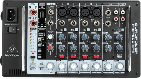 EUROPOWER PMP500MP3Looking for the ultimate, all-in-one portable PA mixer? The EUROPORT PMP500MP3 delivers articulate, high fidelity performance – yet weighs only 3 kg / 6.6 lbs. Thanks to its 8-channel, 500-Watt powered mixer with onboard mp3 player, Reverb and wireless microphone connectivity, the PMP500MP3 can easily fill a large-sized room with crystal-clear, vibrant sound – making you the star of your event! |