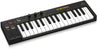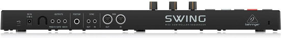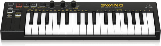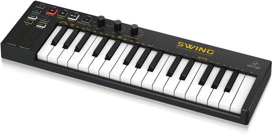 SWING 32-Key USB MIDI Controller Keyboard with 64-Step Polyphonic Sequencing, Chord and Arpeggiator Modes. The Behringer SWING gives you full control over any synthesizer or virtual instrument in your DAW via USB or MIDI. Featuring a 64-step sequencer with an 8-note polyphonic sequence combined with 32 compact-sized keys and pitch and modulation touch-strips provide unlimited ways to express yourself in a compact and portable package. The Keys To It All. The SWING's 32 compact-sized keys create a perfect balance between size and playability. The keys give you the ability to create more nuanced and colorful passages with velocity and after-touch functionality. Use the Pitch and Modulation touch-strips to add even more character to your music. Chord Play Mode allows you to play a chord with up to 16 notes with one single key for some really enchanting Trance music. The SWING also features a 64-step polyphonic sequencer so you can create any progression imaginable and even play over it. Switch to Arpeggiator mode and create an amazing string of notes that can sync to the clock of any device the SWING is connected to Controls. The Style/Pattern knob on the SWING can select up to 8 saved programs in Sequencer style/pattern, while in Arpeggiator style/pattern, you can select different playing orders such as up, down, inclusive, exclusive, random, note order, double up and double down styles/patterns. Select from 8 different time sig.