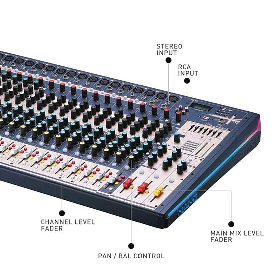 - Mono inputs support balanced XLR and TRS line inputs, while stereo channels feature 4-band EQ and peak LED indicators, offering precise sound control.